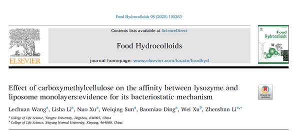 2017级食品加工与安全专业硕士研究生汪乐川在李真顺博士的指导下于2019年8月在《Food Hydrocolloids》期刊以第一作者在线发表了一篇题名为“Effect of carboxymethylcellulose on the affinity between lysozyme and liposome monolayers:evidence for its bacteriostatic mechanism”(DOI: 10.1016/j.foodhyd.2019.105263)的学术论文,该期刊为农业学科SCI收录的一区期刊,影响因子5.839(2018年)。该论文为汪乐川的研究生课题内容,也是李真顺老师的国家自然科学基金项目“羧甲基纤维素调控溶菌酶抑菌活性的分子机制”的部分研究内容。