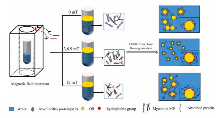 磁场,作为一项绿色安全的物理加工方法,已被应用于提高肉制品色泽和凝胶制品品质等领域。该文进一步研究了不同磁场处理(0、3、6、9、12 mT)对MP结构和乳化性能的影响。结果表明,经3、6、9 mT磁场处理后的MP具有较高的乳化能力、贮存稳定性和表观粘度,这是因为磁场诱导MP的结构展开,疏水性基团暴露,同时使其粒径减小,有利于蛋白质在油水界面的扩散和吸附,从而提高了MP的乳化能力。然而,高强度磁场(12 mT)处理导致MP颗粒聚集,疏水结合位点被掩埋,不利于其包裹油脂,导致乳液稳定性降低。研究结果说明磁场技术是改善MP乳化特性的有效方法。