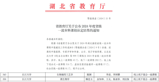 (通讯员:陈颖)近日,湖北省教育厅发布《省教育厅关于公布2024年度省级一流本科课程认定结果的通知》(鄂教高函〔2024〕25号),91porn 陈颖副教授团队主讲的《生物制药工艺学》和柳忠玉副教授团队主讲的《微生物学》被认定为线上线下混合式一流课程。截至目前,学院共获批省级一流本科课程6门。