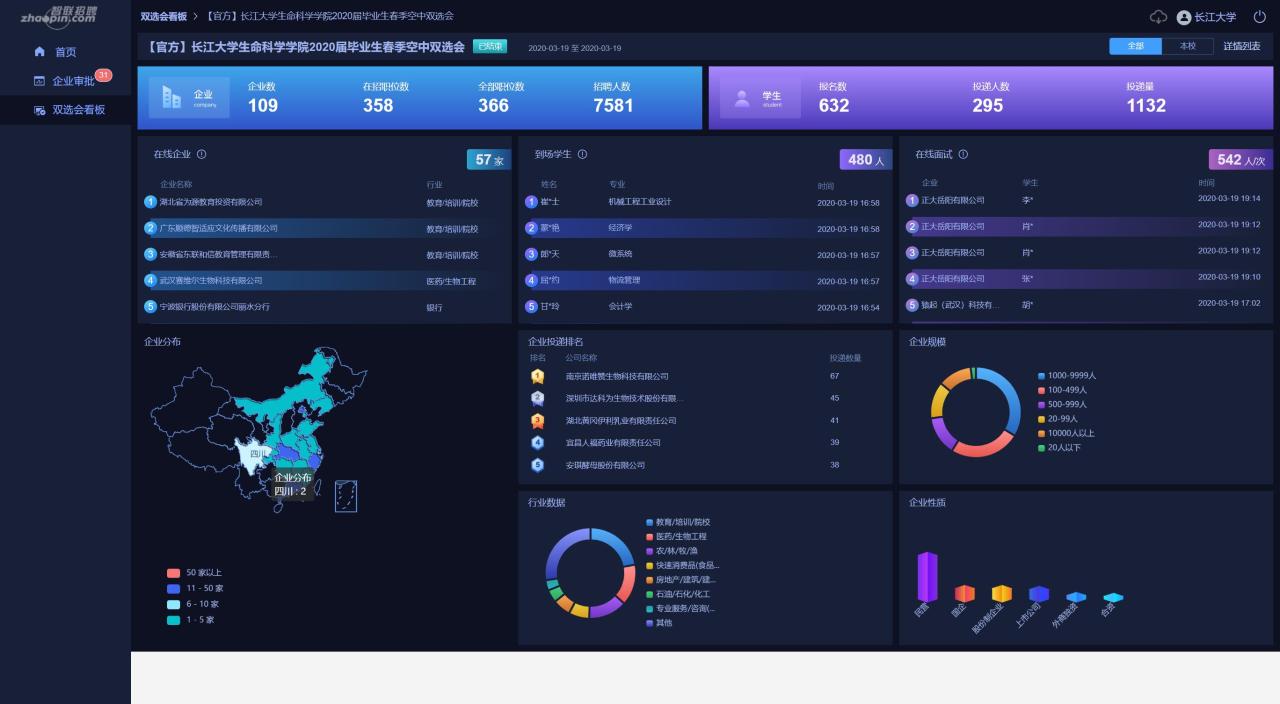 学生,还有本校其他学院和其他高校的学生,共报名632人,投递简历295人,投递简历量1132份,其中本校学生报名人数278人,投递简历量893份,今日到场学生480人,在线面试542人次。