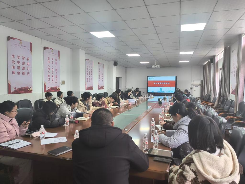 在1教217会议室开展师生干部业务能力专题培训。学院特邀校办副主任陆峰老师做《会议记录纪要规范》专题培训。学院各党支部委员会成员、各科室科长、副科长、学生骨干参加培训会。