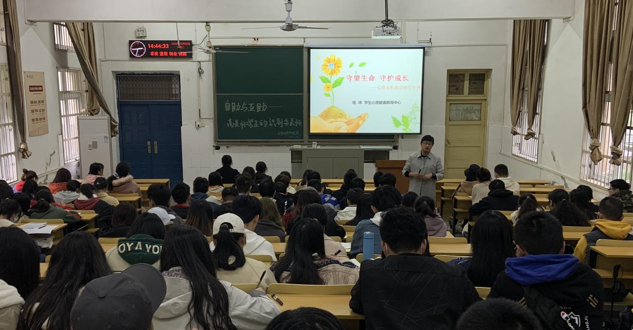 程坤老师围绕我校心理健康教育体系、高关怀学生的类型和表现、心理危机的识别与干预、学生骨干的责任和义务四个方面展开讲解。程老师结合教学经验和自身经历,为同学们深入分析了心理危机存在的必然性和可控性。他提到,“心理危机是可以被早期识别和干预的,人与人之间必然存在着包括亲情、友情、爱情在内的多种‘纽带关系’,当自身或者身边的人出现心理危机特征时,我们可以巧妙利用这些‘纽带’,一定程度上的化解危机,提前干预。”他还强调道,作为学生骨干应深入到学生群体中,主动关心、留意身边同学的行为表现,出现疑似异常状态时主动向老师汇报,及时提供帮助,协力共同营造良好的大学生心理健康氛围。