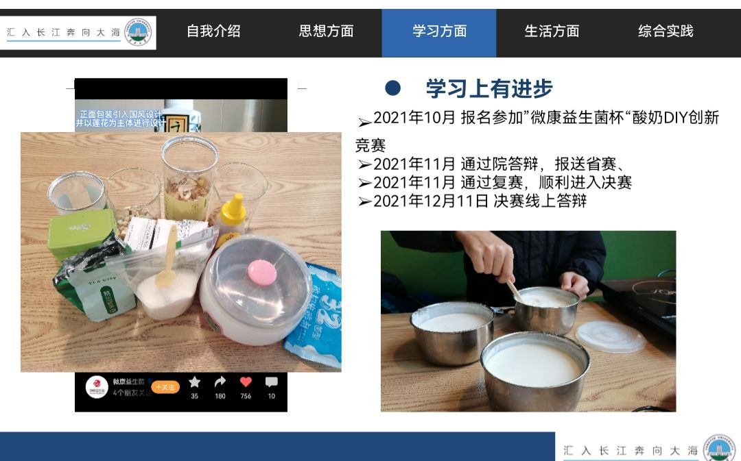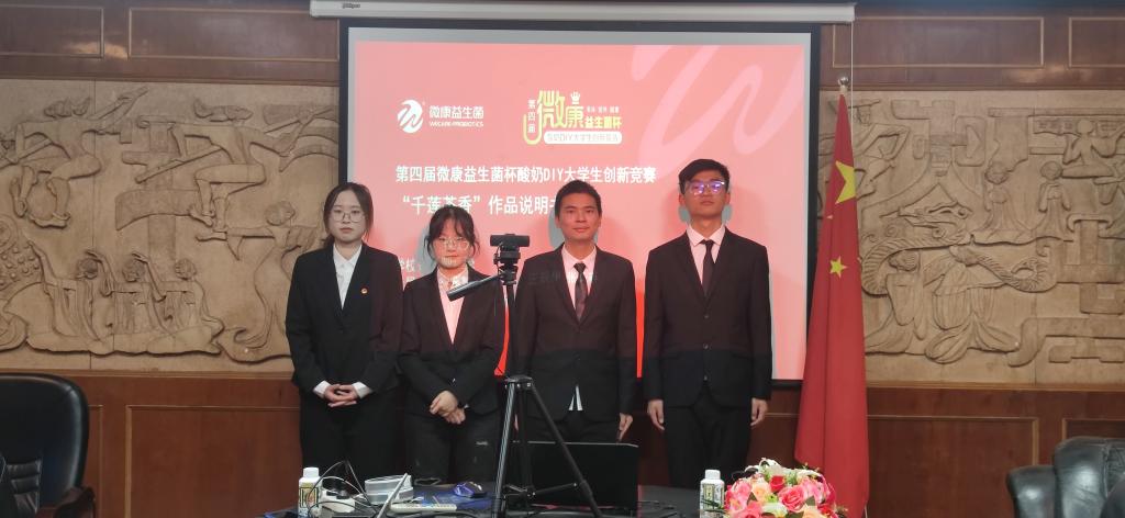 “千莲茶香”团队从摘要、原辅料及生产过程、营养价值、包装设计及创新点四个部分进行了精彩的答辩,在保证营养和口感的前提下,研制出一款内包装创新的茶香型酸奶。在13所高校、22个作品中成功脱颖而出,取得较好的成绩。
