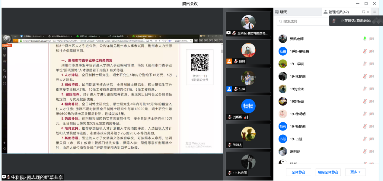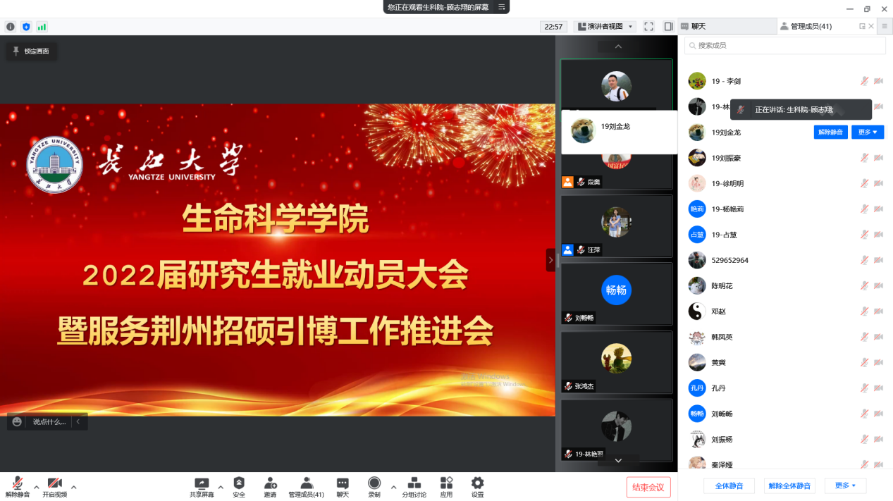 于2022年2月24日下午顺利召开2022届研究生就业动员暨服务荆州招硕引博工作推进会议。根据疫情防控政策要求,本次会议采用腾讯会议方式线上召开。会议由党委副书记汪萍主持,研究生辅导员顾志翔,就业专干郭凯进行宣讲,全体2019级研究生参加。