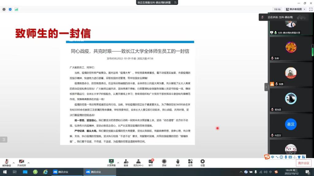 于2022年10月12日晚上召开了在校研究生疫情防控主题班会。本次会议由研究生辅导员顾志翔主持,91porn