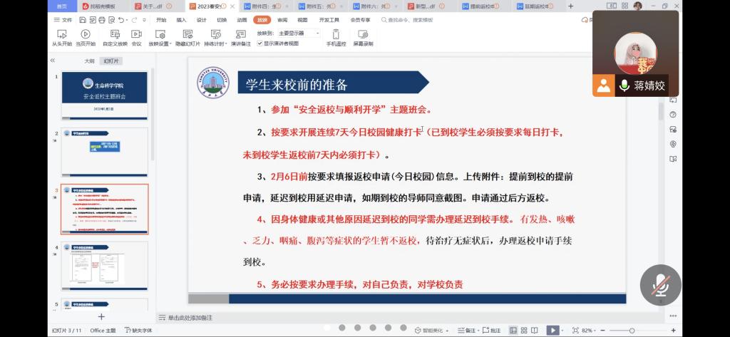 此外会上还提醒同学们在返校路途中注意生命财产安全,谨防诈骗偷窃。做好个人防护,规范佩戴口罩。有任何问题都可以及时向学院老师寻求帮助。