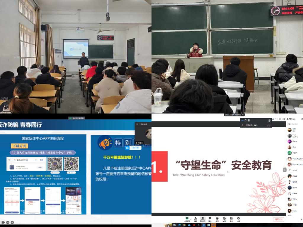班会围绕防诈骗宣传教育、“守望生命”安全教育和学生学业及就业规划三个方面展开。从什么是电信网络诈骗、电信网络诈骗类别、常见诈骗套路揭秘、典型案例到如何提高防诈骗意识,一次生动具体的讲解增强了同学们反诈防骗意识;此外,还围绕消防安全、交通安全、食品安全、网络安全等进行教育和探讨;最后,各班级同学和班主任、辅导员老师结合实际情况对学业和就业情况进行分享交流。