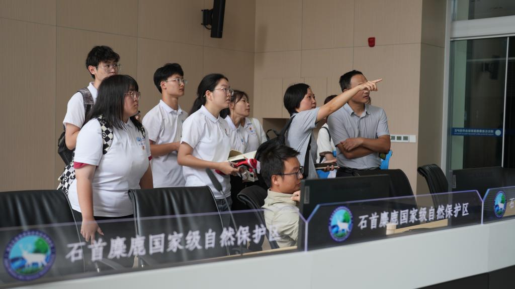参观过程中,杨科长详细介绍着保护区内麋鹿的生存环境、生活习性以及麋鹿种群数量的变化等情况。据杨科长介绍,麋鹿自然保护区已繁衍麋鹿2400余头,其中雄鹿约占38%,雌鹿约占比62%,性比结构优良,但通过无人机实时监测技术,结合麋鹿种群的出生率与死亡率,工作人员推算出麋鹿的种群数量已经达到了该生态系统的环境容纳量。这让队员们认识到了麋鹿生存面临的问题,以及修复长江生态环境的必要性。