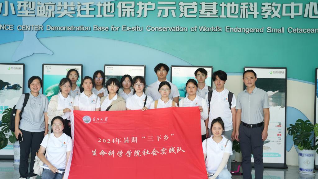 接着,实践队员前往江豚生活水域,实地观察江豚。因为近期暴雨,水位大幅度上升,实践队员只能在江堤上远眺。听讲解员说,江豚是十分有灵性的生物,听到人们的呼唤就会现身。“天天—,萌萌—,贝贝—”实践队员们拖着长音,呼唤着江豚。忽然,水面跃动着一个身影。“来了!江豚!”在水中央,两三头江豚不断跳出水面呼吸,似乎在回应着实践队员们的呼唤。