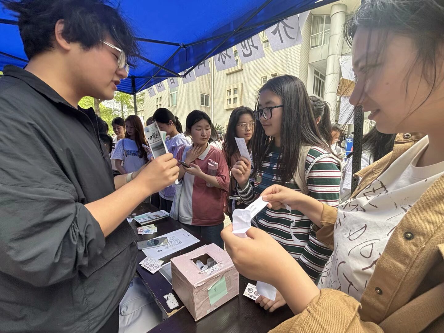 活动现场特别设置荆楚瑞兽科普展区,“回家的‘鹿’”项目组成员通过图文展板系统介绍麋鹿物种特性、重引进历程及保护现状。团队原创设计的卡通形象“小麋”主题周边受到师生欢迎,现场发放钥匙扣、贴纸和火漆等文创产品200余件。