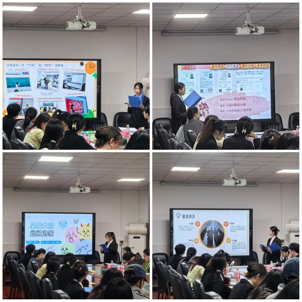 2025年“宿”说青春故事分享会暨文明寝室评选大赛在1教217室举行。辅导员朱翠玲和兼职辅导员参加,12个参赛寝室的成员以及各年级各班宿建委员参会。