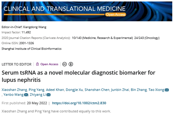 2022520日,91porn 熊涛教授团队和南京鼓楼医院医学检验科李智洋研究员团队合作,在影响因子为11.492的高水平期刊Clinical and Translational Medicine在线发表了题为《Serum tsRNA as a novel molecular diagnostic biomarker for lupus nephritis》的文章。该文分析了狼疮性肾炎(lupus nephritis, LN)血清中tsRNA的表达谱,首次筛选到LN组中显著高表达的tRF-Ala-AGC-2-M4,并对其诊断价值和分子功能进行了评估和预测。团队成员研究生张孝山和南京鼓楼医院医学检验科杨平主管技师为共同第一作者,熊涛教授为本文的第一通讯作者。