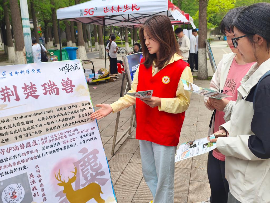 于西校区六七教旁开展“爱护地球,守护伙伴”科普活动。同学们通过打卡集章,与志愿者互动问答,获取精美礼品。活动设置300道物种多样性保护问题,发放500张宣传册,吸引近800名同学参与。活动现场还特别设置荆楚瑞兽科普展区,回家的“鹿”项目组成员通过图文展板系统介绍麋鹿物种特性、重引进历程及保护现状。团队原创设计的卡通形象“小麋”主题周边受到师生欢迎,现场发放钥匙扣、贴纸和火漆等文创产品200余件。