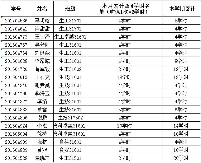 根据课堂考勤结果,累计旷课2学时的,20名同学;累计旷课4学时及以上的(旷课1次=2学时),18名同学;为严肃校风校纪,督促学生按时到课,及时教育违纪学生,根据《91porn 学生违纪处分办法》第十五条、《91porn 课堂考勤实施办法》,经学工办研究决定,对本月累计旷课4学时以上的同学予以通报批评: