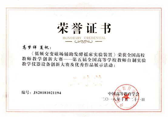 高梦祥教授、夏帆高级工程师的参赛作品的《低频交变磁场辅助发酵摇床实验装置》喜获三等奖。