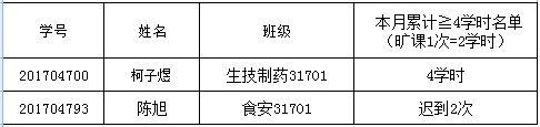 课堂考勤实施办法》,经学工办研究决定,对本月累计旷课4学时及以上、迟到2次及以上同学予以通报批评: